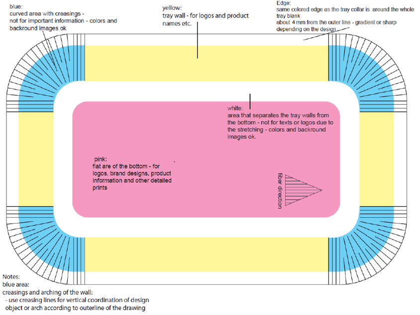 Corners are always round, rim can be with different colors. Our trays can be designed with a max 6 color + varnish (offset printing).